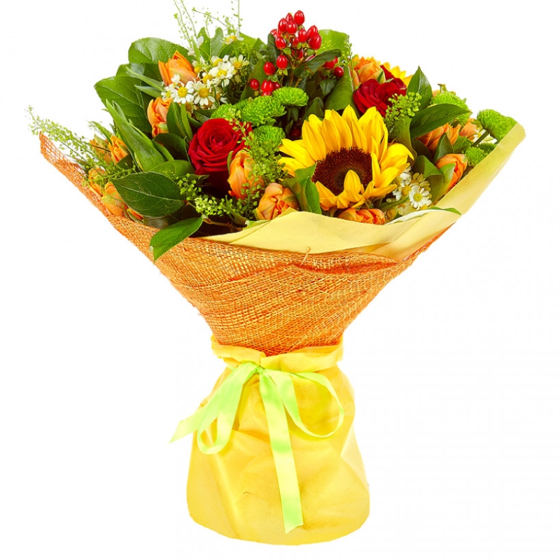 Гиперикум 1 шт., Подсолнух 3 шт., Роза 5 шт., Тюльпан 25 шт., Хризантема 5 шт., Хризантема Сантини 3 шт. |