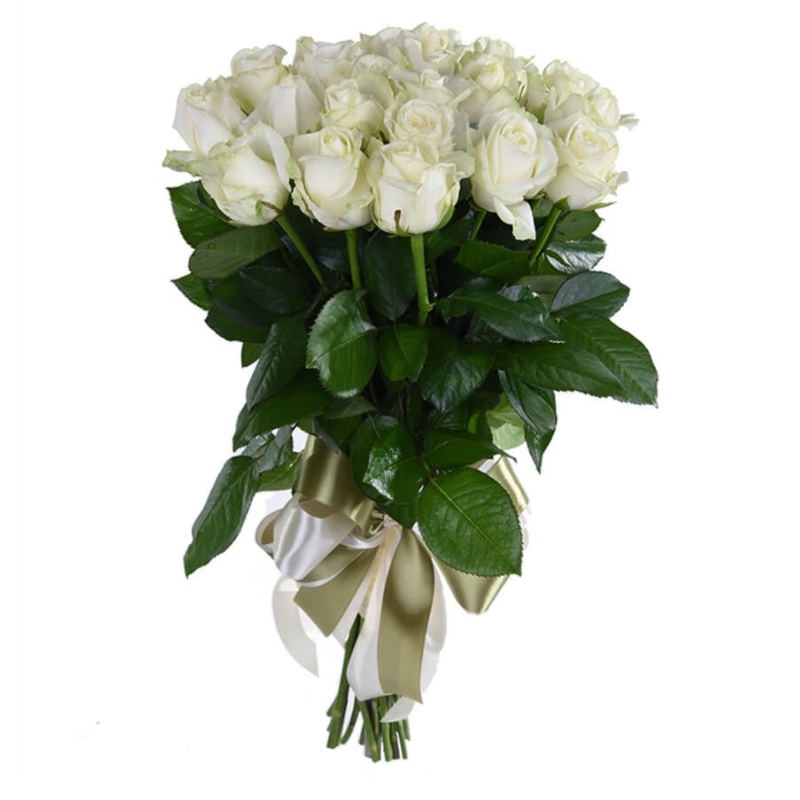 Букет состоит из 19 белых роз, прозрачная упаковка, атласная лента.