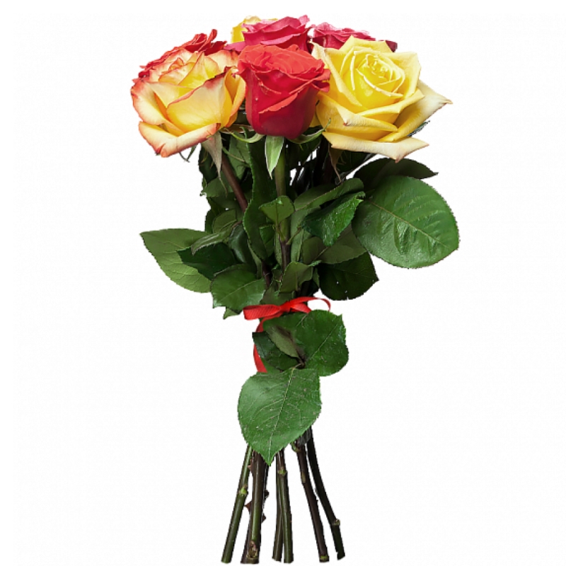 Букет состоит из 2 красные розы, 2 розовые розы, 3 желтые розы, прозрачная упаковка, атласная лента.