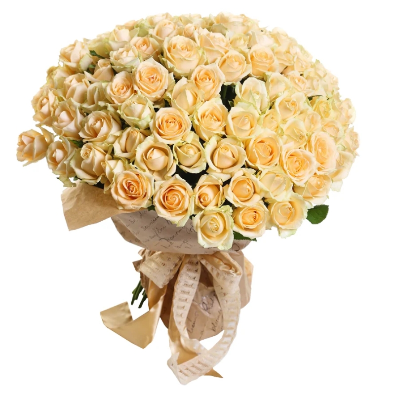 Букет состоит из 101 кремовая роза, крафт, атласная лента.