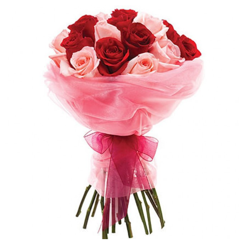 Букет состоит из 9 красных роз, 8 розовых роз, розовая упаковка, атласная лента.