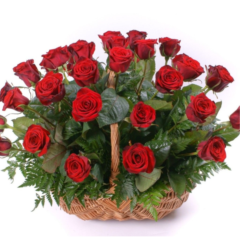 35 красных роз, зелень, корзина.